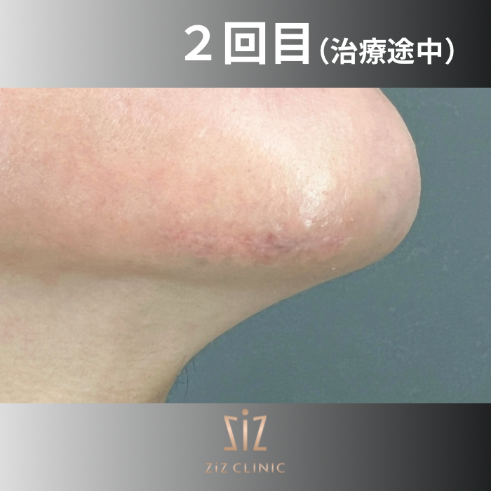 1回目のダウンタイムでまだ赤みが出ていますが、残りの施術で赤みに効果がある585レーザーとドライニードルも使用してさらに傷跡を綺麗にしていきます。
